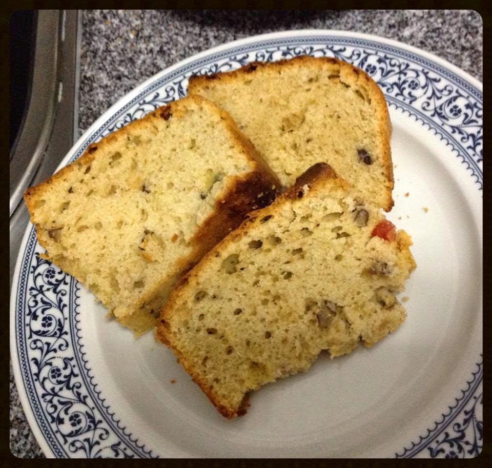 Finally, add yeast, the walnuts and the glaced fruit and mix very well. Put the mixture on a baking pan ( I used a rectangular one) and take it to a pre heated oven at 180 celsius degrees (356ยบ Fahrenheit) for 1 hour.